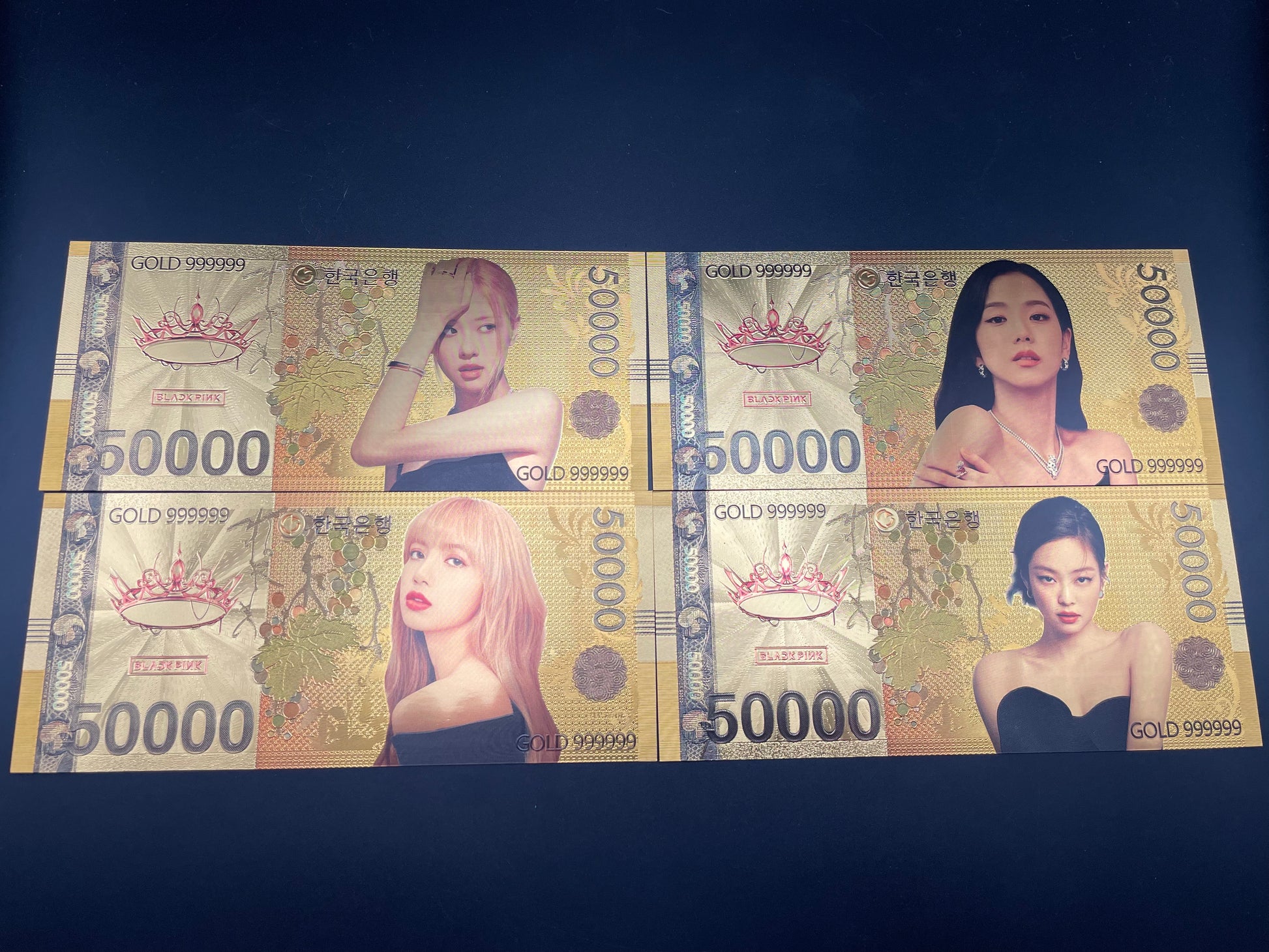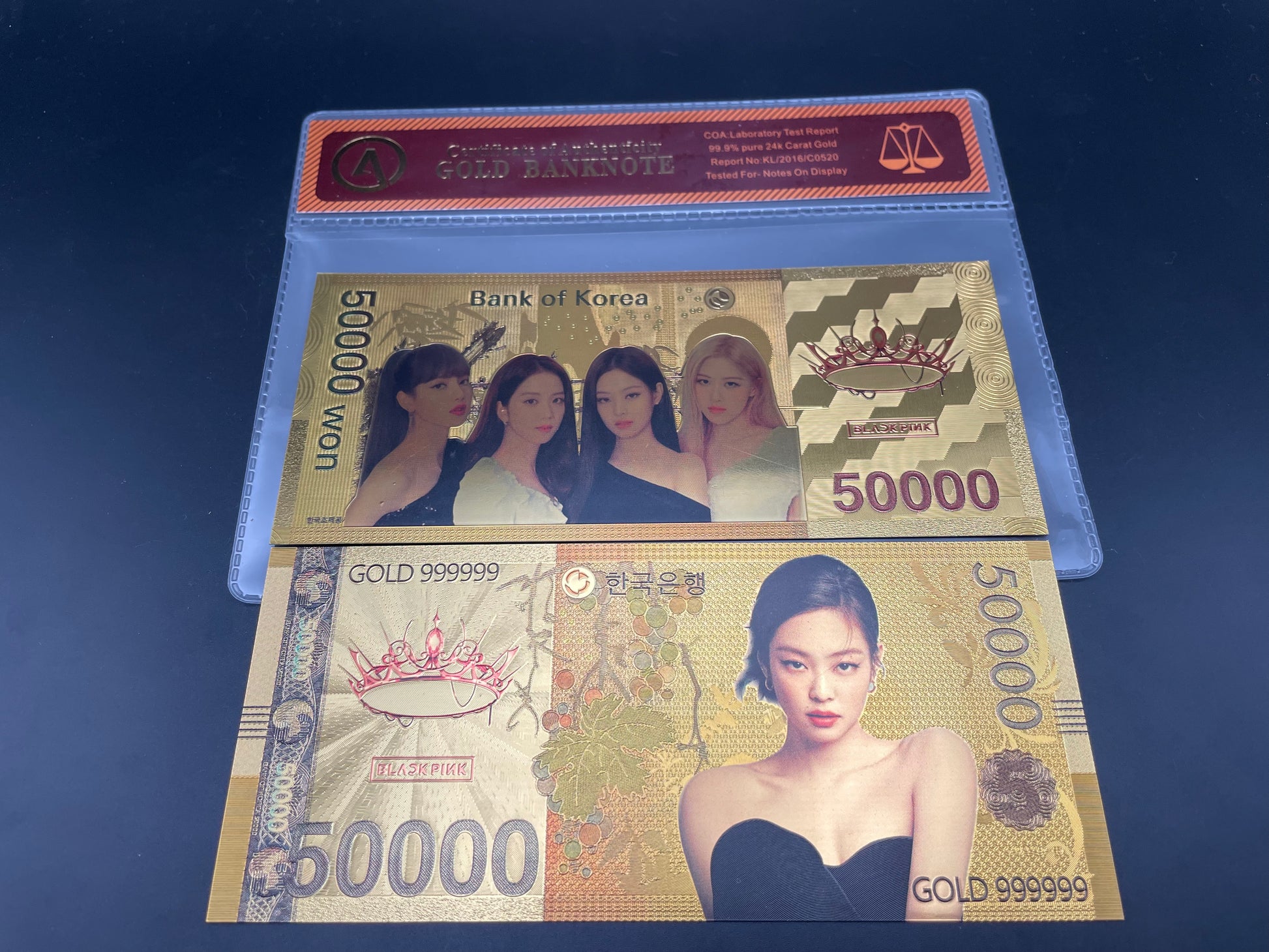 ⭐️ Available for the first time! Have your favorite Blackpink member – Jennie, Lisa, Rose, & Jisoo on a 24k South Korean won representing their country! The Blackpink bills are created and designed by us IG: @anime_currency. Each bill is gold-plated and comes with a Certificate of Authenticity sleeve. You can also purchase an acrylic display case from us to put the bill in and to display it nicely!