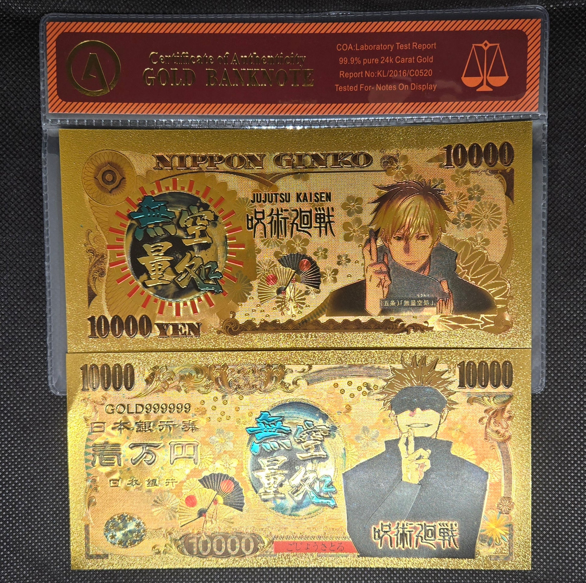 ⭐️ Jujutsu Kaisen gold bills is now available online! Portrays your favorite character on the front of the bill and a group pic of the anime on the back of the bill. Each bill is gold-plated and comes with a Certificate of Authenticity sleeve. You can also purchase an acrylic display case from us to put the bill in and to display it nicely!